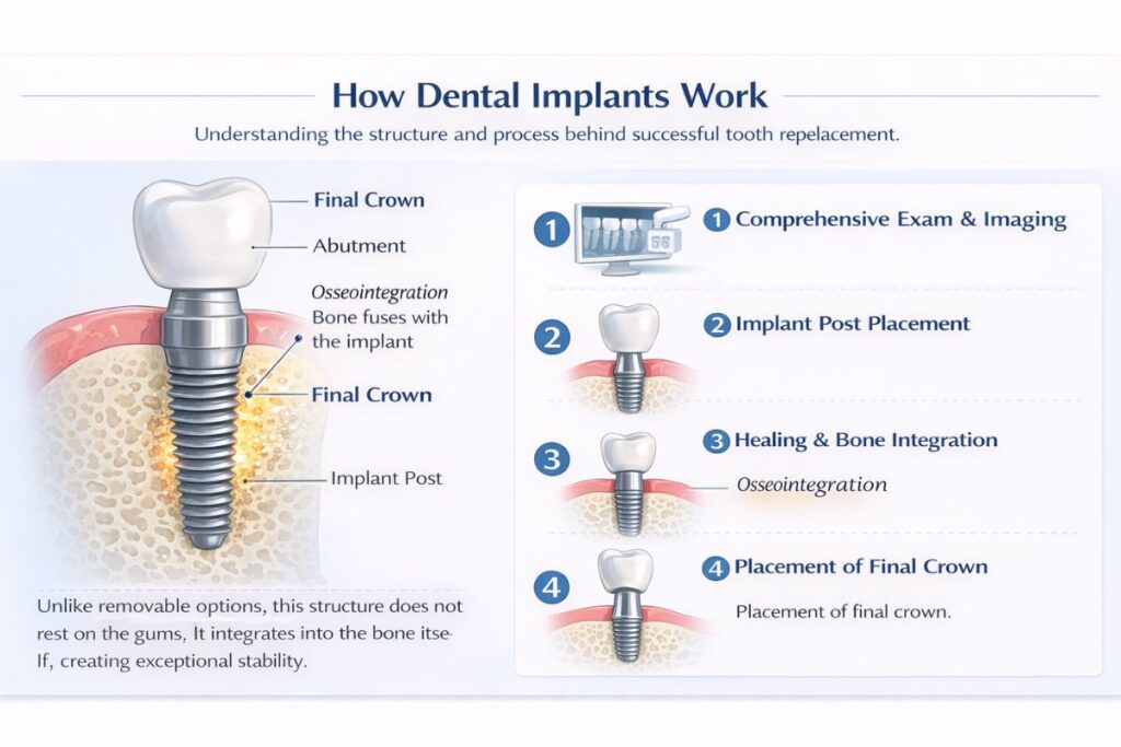 Unlike removable options, this structure does not rest on the gums. It integrates into the bone itself, creating exceptional stability. That integration is what allows patients to chew confidently and speak naturally without fear of movement.